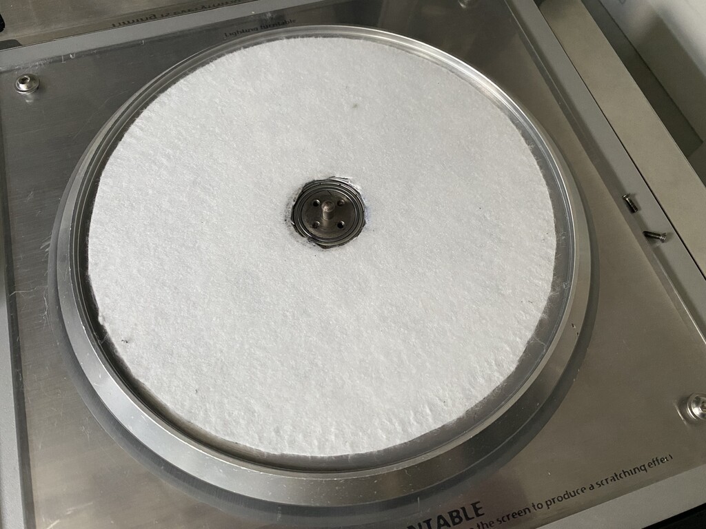 After you cut it to the appropriate size, place it with the felt facing up. I used the old plastic ring as a mask to mark the cutting line on the slip mat. Make sure it is slightly smaller than the stainless steel turn table based so it does not get jammed when you screw the top disc back on.